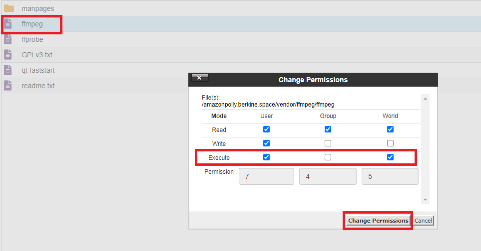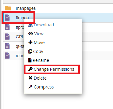 • Step 14: Change file permission of ffmpeg to be executable by anyone.